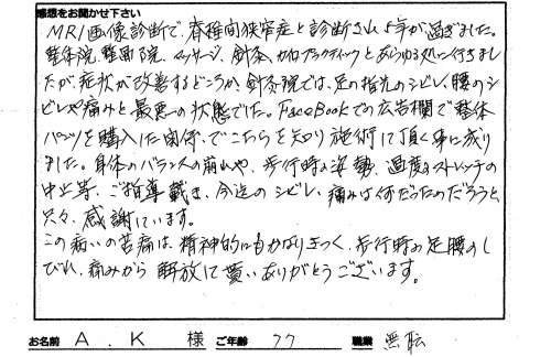身体のバランスの崩れや、歩行時の姿勢、過度のストレッチの中止等、ご指導戴き、今迄のシビレ痛みは何だったのだろうと只々感謝しています。