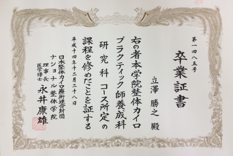 ナショナル整体学院卒業証書