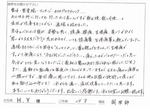 頭痛/肩こり/腰痛でお悩みの山本春代(仮名)様 24歳 調理師