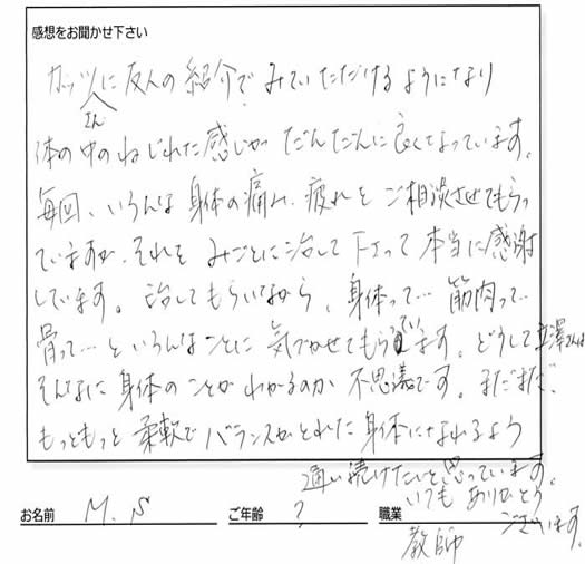 毎回、いろんな身体の痛み、疲れをご相談させてもらってますが、それをみごとに治して下さって本当に感謝しています。