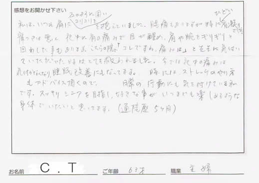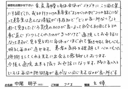首こり/肩こりでお悩みの中尾 明子(仮名) 様 70歳 主婦