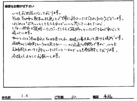 患者の気持ちを理解して心のこもった施術をしてくれる先生に出会えて感謝しております。