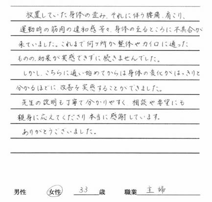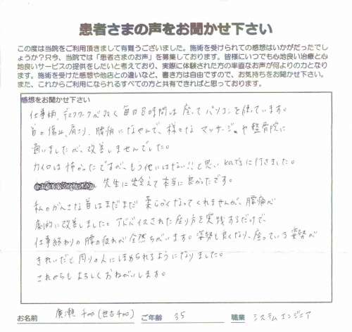 首こり/肩こり/腰痛でお悩みの廣瀬千加 様 35歳 システムエンジニア