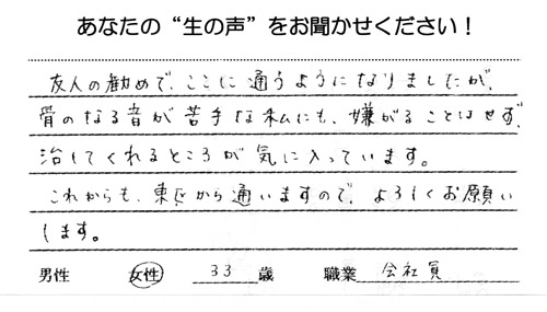 その日その時の身体の状態をご丁寧に診ていただきあいがとうございます。はじめは「ボキッ」としてもらえればいいと思っていましたが、しない理由を説明いただいたうえで施術していただけるので安心して通っています。