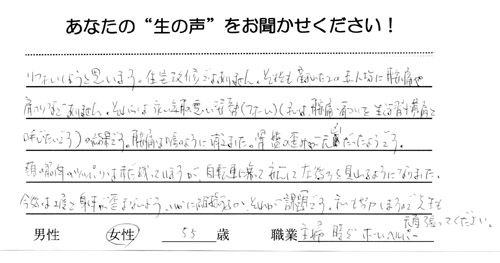 また、通勤でも職場でも家庭でもほとんどが立っていますので日々の痛みと疲労の山積みですが、毎回優しく聞いて下さり、その日、時の状態で施術して頂くので私の駆け込み寺です!!