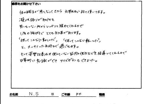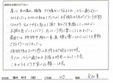 最近では、施術中徐々に首・肩・腰が楽になっていくことを実感できるようになりました。施術後のスッキリ感は気持ちまで明るくなります。