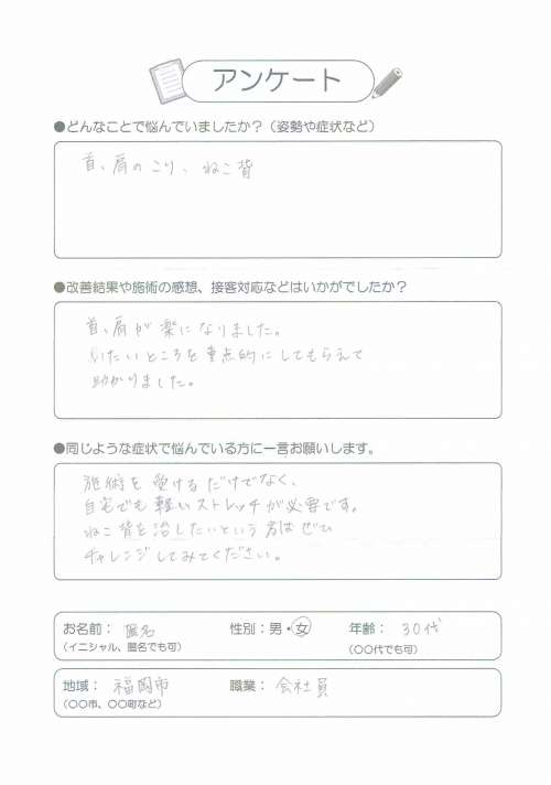 背部痛/首こり/肩こり/腰痛でお悩みのY.U様 40代 会社員