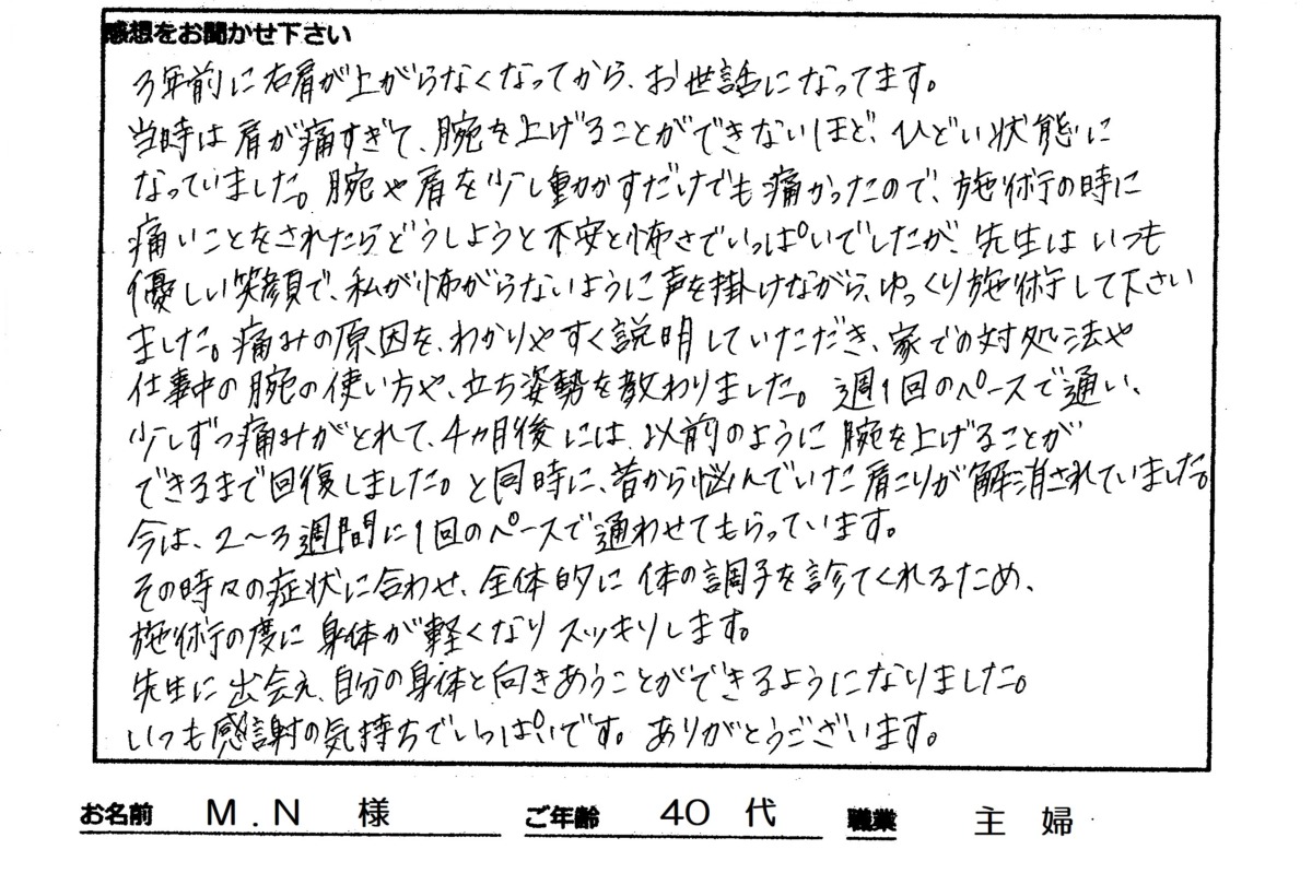 週1回のペースで通い少しずつ痛みがとれて、4カ月後には以前のように腕を上げることができるまで回復しました。